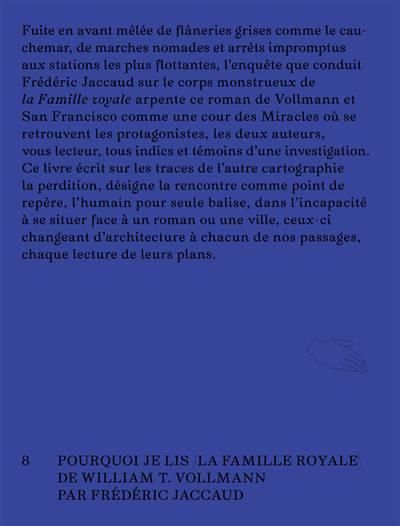 Fuite en avant mêlée de flâneries grises comme le cauchemar, de marches nomades et arrêts impromptus aux stations les plus flottantes, l’enquête que conduit Frédéric Jaccaud sur le corps monstrueux de la Famille royale arpente ce roman de Vollmann et San Francisco comme une cour des Miracles où se retrouvent les protagonistes, les deux auteurs, vous lecteur, tous indics et témoins d’une investigation. Ce livre écrit sur les traces de l’autre cartographie la perdition, désigne la rencontre comme point de repère, l’humain pour seule balise, dans l’incapacité à se situer face à un roman ou une ville, ceux-ci changeant d’architecture à chacun de nos passages, chaque lecture de leurs plans.