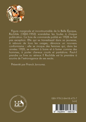 Dans ce livre de commande publié en 1928, Rachilde (qui a alors 68 ans) évoque d’abord les femmes qu’elle a connues et qui l’ont élevée : sa mère et sa grand-mère. Ces portraits hauts en couleurs rejoignent les textes de souvenirs qu’elle publiera des années plus tard. Éternelle provocatrice, Rachilde met en avant les aspects superficielles et dérisoires de la mode des années 1920, qui était assimilée de manière réductrice au féminisme tout entier. Elle se moque des femmes qui se mettent à boire et à fumer comme des hommes, à porter cheveux courts et pantalons, se pliant ainsi à un nouveau conformisme. Elle rappelle qu’elle-même se travestissait en homme quelque quarante ans auparavant, à l’encontre précisément de toutes les modes. Il faut comprendre le titre « Pourquoi je ne suis pas féministe » comme « pourquoi je ne veux pas suivre la mode du jour ». Toute son oeuvre littéraire bouleverse les moeurs de son époque : on se rappelle qu’elle fut condamnée à un an de prison par le parquet de Bruxelles en 1884 pour avoir, entre autres, « inventer un vice nouveau » dans Monsieur Vénus. Défendre les vertus de la famille contre l’émancipation des femmes dans les années 1920, c’est encore, de son point de vue, faire preuve d’immoralité ! Un comble pour celle qui décrivit dans ses romans toutes les perversions imaginables : travestissements et inversions en tout sens, zoophilie, nécrophilie, pédophilie, etc.