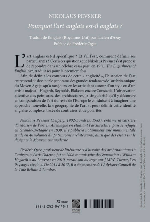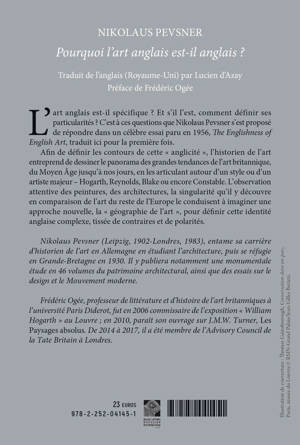 L'art anglais est-il specifique ? Et s'il l'est, comment definir ses particularites ? C'est a ces questions que Nikolaus Pevsner s'est propose de repondre dans un celebre essai paru en 1956, The Englishness of English Art, traduit ici pour la premiere fois. Afin de definir les contours de cette anglicite , l'historien de l'art entreprend de dessiner le panorama des grandes tendances de l'art britannique, du Moyen Age jusqu'a nos jours, en les articulant autour d'un style ou d'un artiste majeur - Hogarth, Reynolds, Blake ou encore Constable. L'observation attentive des peintures, des architectures, la singularite qu'il y decouvre en comparaison de l'art du reste de l'Europe le conduisent a imaginer une approche nouvelle, la geographie de l'art , pour definir cette identite anglaise complexe, tissee de contraires et de polarites.