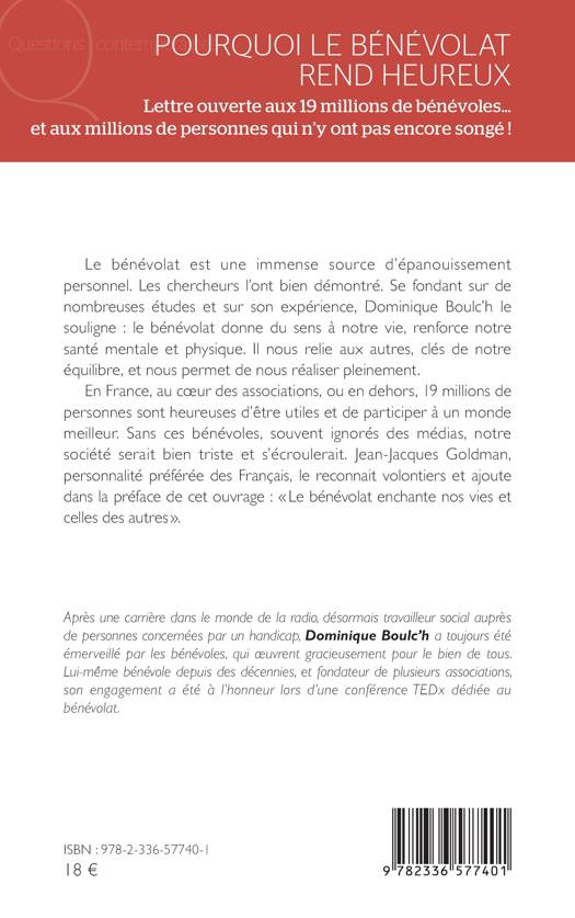 Le bénévolat est une immense source d'épanouissement personnel. Les chercheurs l'ont bien démontré. Se fondant sur de nombreuses études et sur son expérience, Dominique Boulc'h le souligne le bénévolat donne du sens à notre vie, renforce notre santé mentale et physique. Il nous relie aux autres, clés de notre équilibre, et nous permet de nous réaliser pleinement. En France, au coeur des associations, ou en dehors, 19 millions de personnes sont heureuses d'être utiles et de participer à un monde meilleur. Sans ces bénévoles, souvent ignorés des médias, notre société serait bien triste et s'écroulerait. Jean-Jacques Goldman, personnalité préférée des Français, le reconnait volontiers et ajoute dans la préface de cet ouvrage Le bénévolat enchante nos vies et celles des autres .
