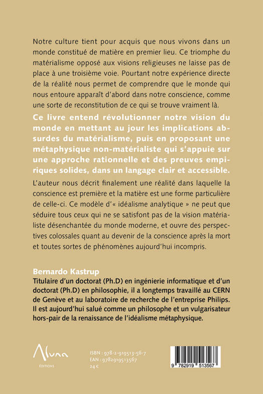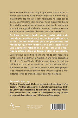 Notre culture tient pour acquis que nous vivons dans un monde constitué de matière en premier lieu. Ce triomphe du matérialisme opposé aux visions religieuses ne laisse pas de place à une troisième voie. Pourtant notre expérience directe de la réalité nous permet de comprendre que le monde qui nous entoure apparaît d’abord dans notre conscience, comme une sorte de reconstitution de ce qui se trouve vraiment là. Ce livre entend révolutionner notre vision du monde en mettant au jour les implications absurdes du matérialisme, puis en proposant une métaphysique non-matérialiste qui s’appuie sur une approche rationnelle et des preuves empiriques solides, dans un langage clair et accessible. L’auteur nous décrit finalement une réalité dans laquelle la conscience est première et la matière est une forme particulière de celle-ci. Ce modèle d’« idéalisme analytique » ne peut que séduire tous ceux qui ne se satisfont pas de la vision matérialiste désenchantée du monde moderne, et ouvre des perspectives colossales quant au devenir de la conscience après la mort et toutes sortes de phénomènes aujourd’hui incompris.