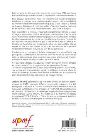 Pour dépasser le dilemme entre croissance économique (PIB) pour lutter contre le chômage et décroissance pour préserver notre environnement, il faut arrêter d'identifier la valeur des biens et des services à leur seule valeur d'échange, c'est-à-dire à leur prix. Cet ouvrage fait des propositions pour réfléchir aux principales caractéristiques que devrait avoir la notion de valeur et de richesse économique pour répondre aux enjeux sociétaux et environnementaux de nos sociétés.