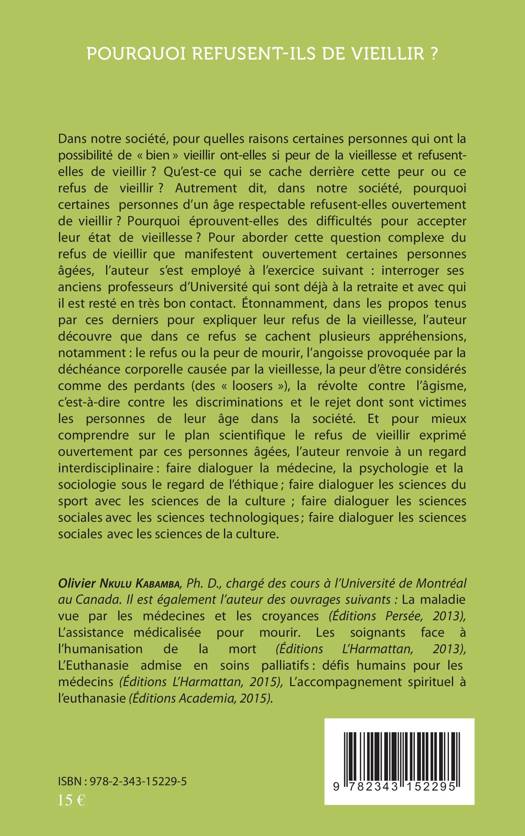 Pour quelles raisons certaines personnes qui ont la possibilité de « bien » vieillir ont-elles si peur de la vieillesse et refusent-elles de vieillir ? Qu'est-ce qui se cache derrière cette peur ou ce refus de vieillir ? Autrement dit, dans notre société, pourquoi certaines personnes d'un âge respectable refusent-elles ouvertement de vieillir ? Outre l'interrogation de son entourage profesionnel l'auteur fait dialoguer la médecine, la psychologie et la sociologie sous le regard de l'éthique ; les sciences du sport avec celle de la culture ; les sciences sociales avec les sciences technologiques ; les sciences sociales avec les sciences de la culture.
