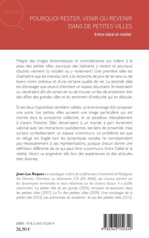 Malgré des images fantomatiques et contradictoires qui collent à la peau des petites villes, pourquoi des habitants y restent et pourquoi d'autres viennent s'y installer ou y reviennent ? Les individus sont à la recherche de prix de terrains ou de loyers moins onéreux et d'une certaine qualité de vie. D'autres cherchent un espace sécuritaire. Par ailleurs les petites villes ne reviennent-elles pas à un monde fortement valorisé avec ses interractions quotidiennes,ses commerces de proximité mais surtout un espace "commun". Entre l'idéal et la réalité des exépriences bien diverses se vivent.