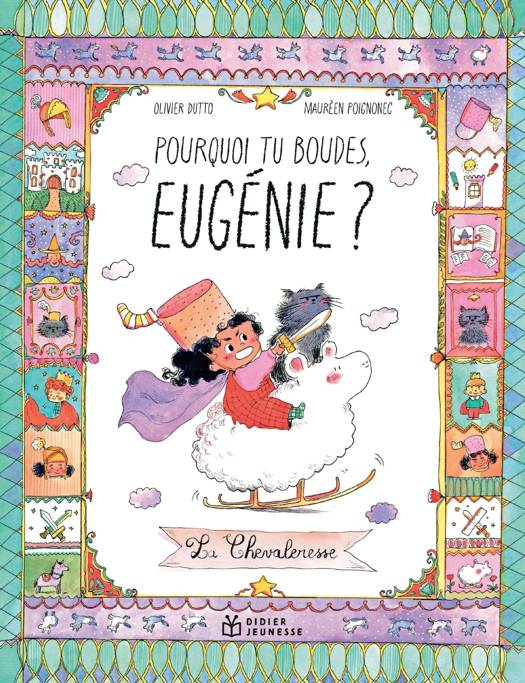 Eugénie boude. Elle boude parce qu’elle a dit à papa ‘Je veux être chevalier !’ et que papa lui a répondu que ce n’était pas possible. Eugénie s’insurge : c’est parce qu’elle est une fille, c’est ça ? parce qu’on dit pas LA chevalier ? Eh bien voilà, à partir d’aujourd’hui, elle, Eugénie, cheffe des boudeuses, décide qu’on peut dire LA Chevalier et s’il y en a qui sont pas contents, qu’ils viennent la voir et elle les enfermera dans un cachot, ou leur fera manger la litière de Touffu, son chat ! Et voilà Eugénie partie dans une grande révolution…