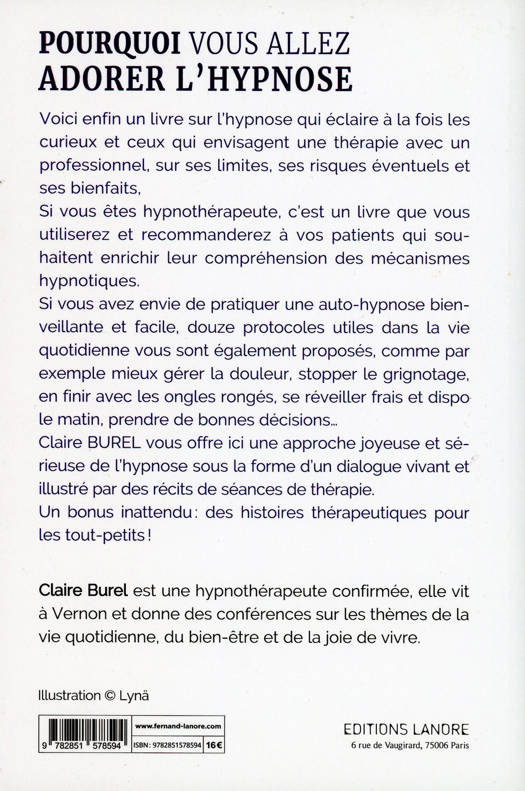 Voici enfin un livre sur l'hypnose qui éclaire à la fois les curieux et ceux qui envisagent une thérapie avec un professionnel, sur ses limites, ses risques éventuels et ses bienfaits. Si vous êtes hypnothérapeute, c'est un livre que vous utiliserez et recommanderez à vos patients qui souhaitent enrichir leur compréhension des mécanismes hypnotiques. Si vous avez envie de pratiquer une auto-hypnose bienveillante et facile, 12 protocoles utiles dans la vie quotidienne vous sont également proposés, comme par exemple mieux gérer la douleur, stopper le grignotage, en finir avec les ongles rongés, se réveiller frais et dispo le matin, prendre de bonnes décisions... Claire BUREL vous offre ici une approche joyeuse et sérieuse de l'hypnose sous la forme d'un dialogue vivant et illustré par des récits de séances de thérapie. Un bonus inattendu : des histoires thérapeutiques pour les tout-petits !