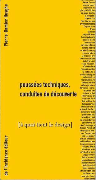 Il s’agit toujours de suggérer une conception de la technique fondée sur une notion de « poussée », de concevoir à partir de cette notion comment des inventions peuvent s’installer dans la culture et de distinguer dans cette installation deux moments, celui de l’économie et celui de la découverte. Le livre admet une hypothèse qui n’est sûrement pas des plus fréquentes, savoir que les opérations artistiques sont parentes de la technique et de son histoire. À occuper pareille position nous ne sommes aujourd’hui disposés ni du côté de la technique ni du côté de l’art. L’une et l’autre se posent séparément. Chez les spécialistes de la technique, on ne voit pas d’inconvénient à cette séparation quand bien même elle aboutit à laisser hors du champ le monde pourtant fort appareillé de l’audio-visuel et des médias. Chez les artistes, ce n’est pas négligence mais revendication : tout un ralliement s’est fait autour d’une idée spéculative de l’art qui ne pouvait procéder que d’une prise de distance à l’égard de la chair des techniques. S’il y a une pensée du design au deux sens possibles de l’expression (une pensée qui s’attache à faire cas du design et une pensée qui vient de lui), elle n’est d’aucun de ces côtés. Il s’agit, pour rappeler une formule fameuse, de chercher à lier fonction et forme.