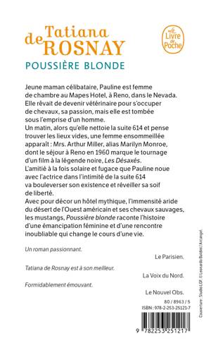 Jeune maman célibataire, Pauline est femme de chambre au Mapes Hotel, à Reno, dans le Nevada. Elle rêvait de devenir vétérinaire pour s’occuper de chevaux, sa passion, mais elle est tombée sous l’emprise d’un homme. Un matin, alors qu’elle nettoie la suite 614 et pense trouver les lieux vides, une femme ensommeillée apparaît : Mrs. Arthur Miller, alias Marilyn Monroe, dont le séjour à Reno en 1960 marque le tournage d’un film à la légende noire, Les Désaxés. L’amitié à la fois solaire et fugace que Pauline noue avec l’actrice dans l’intimité de la suite 614 va bouleverser son existence et réveiller sa soif de liberté. Avec pour décor un hôtel mythique, l’immensité aride du désert de l’Ouest américain et ses chevaux sauvages, les mustangs, Poussière blonde raconte l’histoire d’une émancipation féminine et d’une rencontre inoubliable qui change le cours d’une vie.