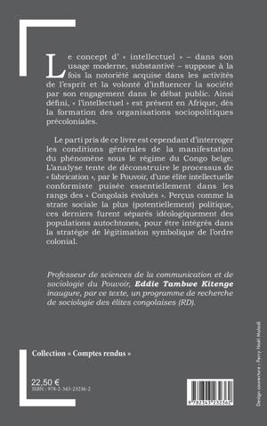 Ce livre interroge le phénomène d'intellectuels sous le régime du Congo belge. L'analyse tente de déconstruire le processus de fabrication, par le Pouvoir, d'une élite intellectuelle conformiste puisée essentiellement dans les rangs des Congolais évolués . Perçus comme la strate sociale la plus (potentiellement) politique, ces derniers furent séparés idéologiquement des populations autochtones, pour être intégrés dans la stratégie de légitimation symbolique de l'ordre colonial.