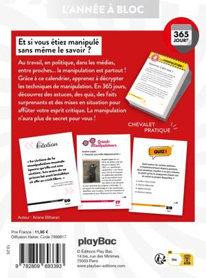 Au travail, en politique, dans les médias, entre proches… la manipulation est partout ! Grâce à ce calendrier, apprenez à repérer les manipulateurs, à décrypter leurs techniques et à déjouer leurs pièges. En 365 jours, découvrez des astuces, des quiz, des faits surprenants et des mises en situation pour affûter votre esprit critique et reprendre le contrôle.