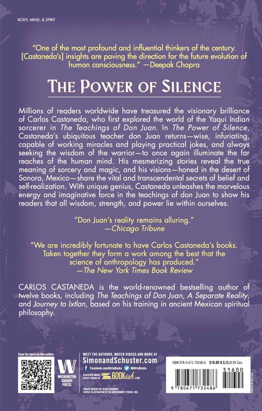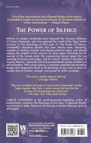 The Power of Silence provides a brilliant flash of knowledge that illuminates the far reaches of the human mind--through don Juan's mesmerizing stories, the true meaning of sorcery and magic is finally revealed. Now, Castaneda's ubiquitous teacher don Juan returns--wise, infuriating, capable of working miracles and playing practical jokes, and always seeking the wisdom of the warrior--to once again illuminate the far reaches of the human mind. His captivating stories and his visions--honed in the desert of Sonora, Mexico--share the vital and transcendental secrets of belief and self-realization. With unique genius, Castaneda unleashes the marvelous energy and imaginative force in the teachings of don Juan to show his readers that all wisdom, strength, and power lie within ourselves.