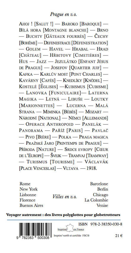 Organisé autour de 50 mots‐clefs qui, de Ahoj (salut) à Vltava en passant par défenestration, Golem, Kafka, cubisme ou marionnettes, ce lexique amoureux rassemble pour chaque entrée une courte introduction éclairant les aspects de Prague sous un angle historique, géographique ou anecdotique, un texte littéraire en version originale, sélectionné avec soin, et, sauf pour Chateaubriand ou Apollinaire, sa traduction. Un joli petit livre qui invite à suivre les pas tracés par les textes en tchèque, en allemand et en slovaque mais aussi en latin, en anglais, en espagnol ou en italien.