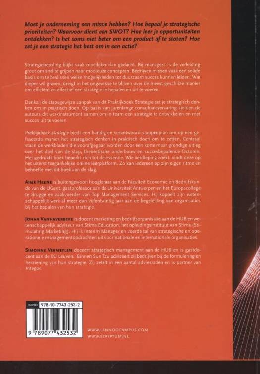 Een praktische handleiding om je bedrijfsstrategie te realiseren Moet je onderneming een missie hebben? Hoe bepaal je strategische prioriteiten? Waarvoor dient een SWOT? Hoe leer je opportuniteiten ontdekken? Is het soms niet beter om een product af te stoten? Hoe zet je een strategie het best om in een actie? Strategiebepaling blijkt vaak moeilijker dan gedacht. Bij managers is de verleiding groot om snel te grijpen naar modieuze concepten. Bedrijven missen vaak een solide basis om te beslissen welke mogelijkheden tot duurzaam succes kunnen leiden. Wie dieper wil graven, dreigt in het ongewisse te blijven over de meest geschikte manier om efficiënt en effectief een strategie te bepalen en uit te voeren. Dankzij de stapsgewijze aanpak van dit Praktijkboek Strategie zet je strategisch denken om in praktisch doen. Op basis van jarenlange consultancyervaring stelden de auteurs dit werkinstrument samen om in team een strategie te ontwikkelen en met succes uit te voeren. Praktijkboek Strategie biedt een handig en verantwoord stappenplan om op een gefaseerde manier het strategisch denken in praktisch doen om te zetten. Centraal staan de werkbladen die voorafgegaan worden door een korte maar grondige uitleg over het doel van de stap, theoretische onderbouw en succesbepalende factoren. Het gedrukte boek beperkt zich tot de essentie. Wie verdieping zoekt, vindt deze op het uiterst toegankelijke online leerplatform. Zo kan iedereen op zijn eigen ritme en behoefte met dit boek aan de slag. Met een unieke code die gratis toegang verleent tot een online leerplatform -