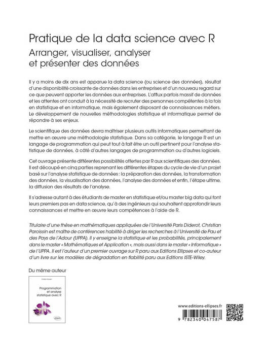 Cet ouvrage s'adresse tant à des étudiants de master en statistique et/ou master big data qui font leurs premiers pas en data science, qu'à des ingénieurs qui souhaitent approfondir leurs connaissances et mettre en œuvre leurs compétences à l'aide de R, en reprenant les différentes étapes du cycle de vie d'un projet basé sur l’analyse statistique de données : la préparation des données, la transformation des données, la visualisation des données, l'analyse des données et enfin, l'étape ultime, la diffusion des résultats de l'analyse.