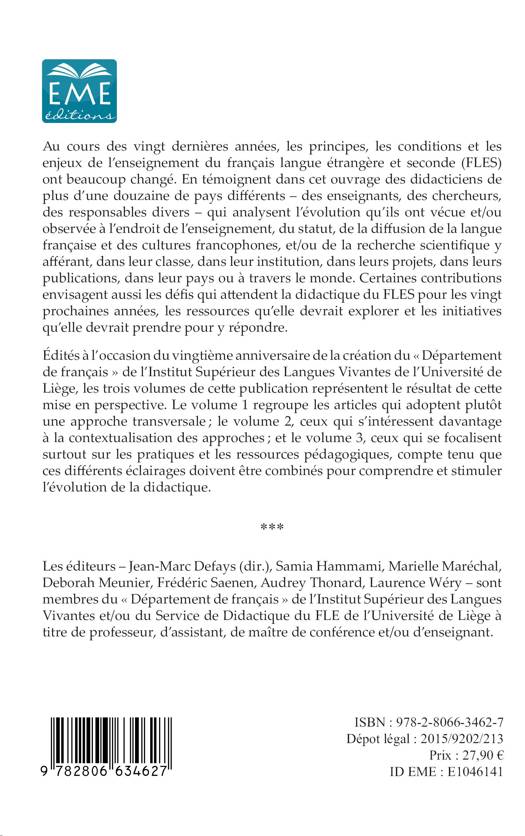 Au cours des vingt dernières années, les principes, conditions et enjeux de l'enseignement du français langue étrangère et seconde (FLES) ont beaucoup changé. En témoignent les didacticiens d'une douzaine de pays qui analysent l'évolution qu'ils ont vécue et/ou observée à l'endroit de l'enseignement, du statut, de la diffusion de la langue française et des cultures francophones, et/ou de la recherche scientifique. Le volume 3 se focalise sur les pratiques et les ressources pédagogiques.