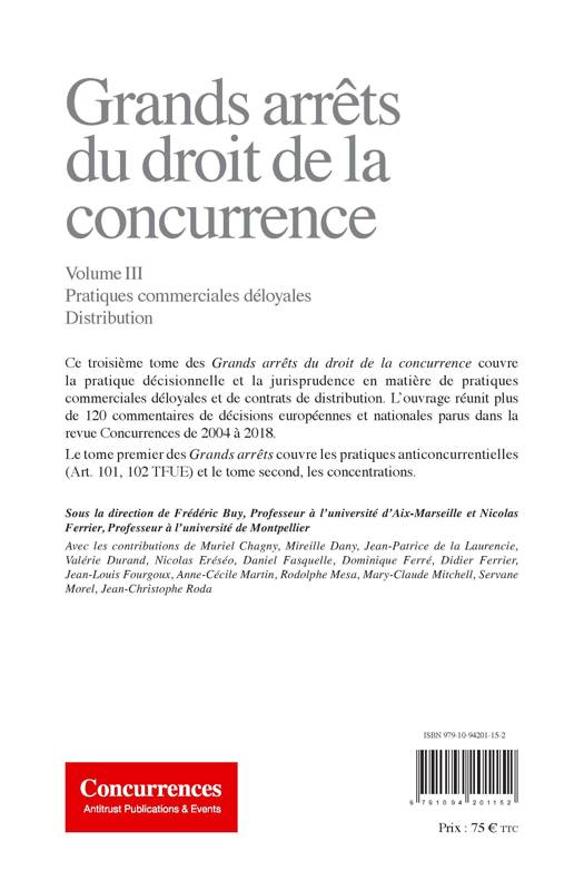 Ce troisième tome des Grands arrêts du droit de la concurrence couvre la pratique décisionnelle et la jurisprudence en matière de pratiques commerciales déloyales et de contrats de distribution. L'ouvrage réunit plus de 120 commentaires de décisions européennes et nationales parus dans la revue Concurrences de 2004 à 2018. Le tome premier des Grands arrêts couvre les pratiques anticoncurrentielles (Art. 101, 102 TFUE) et le tome second, les concentrations.
