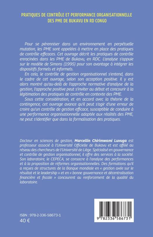 Pour se pérenniser dans un environnement en perpétuelle mutation, les PME sont appelées à mettre en place des pratiques de contrôle efficaces. Cet ouvrage décrit les pratiques de contrôle enracinées dans les PME de Bukavu, en RDC. L'analyse s'appuie sur le modèle de Simons (1995) pour son avantage à intégrer les dispositifs formels et informels. En cela, le contrôle de gestion organisationnel s'entend, dans le cadre de cet ouvrage, selon son acception positive. Il y est alors montré qu'au-delà de l'approche normative d'analyse de la gestion, l'approche positive peut s'inviter au débat et concourir à la légitimation des pratiques de contrôle en contexte des PME. Sous cette considération, et en accord avec la théorie de la contingence, cet ouvrage avance qu'il peut s'agir d'une erreur de croire qu'un contrôle de gestion efficace, susceptible de conduire à une performance organisationnelle adaptée aux réalités des PME, ne peut s'identifier que dans la formalisation des pratiques.