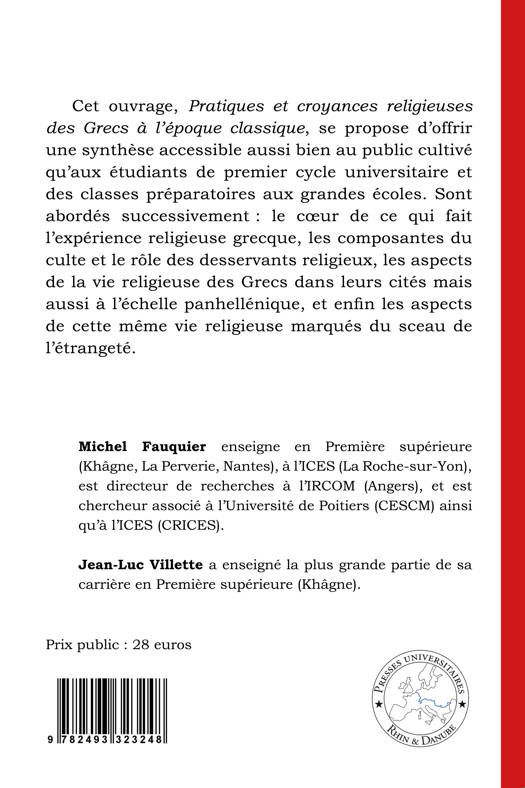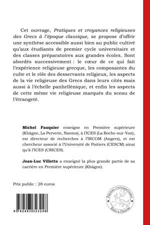 Cet ouvrage, Pratiques et croyances religieuses des Grecs à l’époque classique, se propose d’offrir une synthèse accessible aussi bien au public cultivé qu’aux étudiants de premier cycle universitaire et des classes préparatoires aux grandes écoles. Sont abordés successivement : le cœur de ce qui fait l’expérience religieuse grecque, les composantes du culte et le rôle des desservants religieux, les aspects de la vie religieuse des Grecs dans leurs cités mais aussi à l’échelle panhellénique, et enfin les aspects de cette même vie religieuse marqués du sceau de l’étrangeté.
