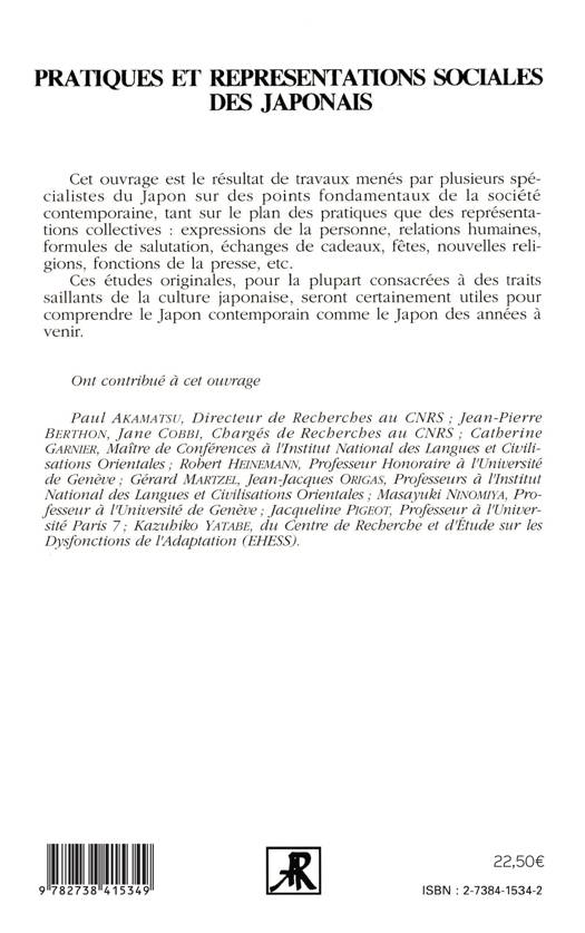 Cet ouvrage est le résultat de travaux menés par plusieurs spécialistes du Japon sur des points fondamentaux de la société contemporaine, tant sur le plan des pratiques que des représentations collectives : expressions de la personne, relations humaines, formules de salutation, échanges de cadeaux, fêtes, nouvelles religions, fonctions de la presse, etc. Ces études originales, pour la plupart consacrées à des traits saillants de la culture japonaise, seront certainement utiles pour comprendre le Japon contemporain comme le Japon des années à venir.