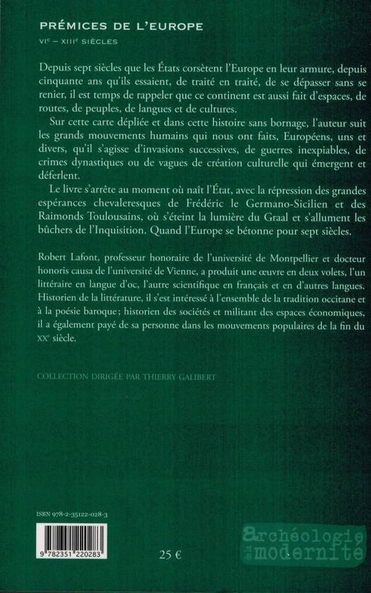 Depuis sept siècles que les États corsètent l'Europe en leur armure, depuis cinquante ans qu'ils essaient, de traité en traité, de se dépasser sans se renier, il est temps de rappeler que ce continent est aussi fait d'espaces, de routes, de peuples, de langues et de cultures. Sur cette carte dépliée et dans cette histoire sans bornage, Robert Lafont parcourt les grands mouvements humains qui nous ont faits, Européens, uns et divers, qu'il s'agisse d'invasions successives, de guerres inexpiables, de crimes dynastiques ou de vagues de création culturelle qui émergent et déferlent.