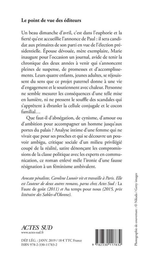 Quand son mari se présente aux primaires en vue de l'élection présidentielle, Marie entame un journal, avide de tenir la chronique des deux années qui s'annoncent pleines de promesses et d'accomplissements. Mais écrire devient peu à peu un exutoire face aux scandales qui l'ébranlent et à la liste des couleuvres qu'elle doit stoïquement avaler. Que faut-il d'abnégation, de cynisme, d'amour ou d'ambition pour accompagner un homme jusqu'aux portes du palais ? Un roman intime, social et politique, qui mêle l'ironie d'une fausse résignation à un féminisme ambivalent.