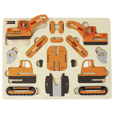 17 pièces en bois découpé et verni, à assembler selon le schéma de montage pour construire la pelleteuse.