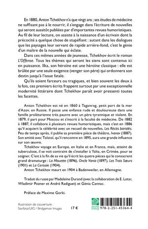 En 1880, Anton Tchekhov n’a que vingt ans ; ses études de médecine ne suffisant pas à le nourrir, il s’engage dans l’écriture de nouvelles qui seront aussitôt publiées par d’importantes revues humoristiques. Au fil de leur lecture, on assiste à la naissance d’un écrivain dont la précocité a quelque chose de stupéfiant : autant dans les dialogues que les paysages leur servant de rapide arrière-fond, c’est le génie d’un maître de la nouvelle qui éclate.