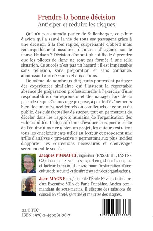Qui n'a pas entendu parler de Sullenberger, alias Sully, ce pilote d'avion qui a sauvé la vie de tous ses passagers grâce à une décision à la fois rapide, surprenante d'abord mais remarquablement assumée, d'amerrir d'urgence sur le fleuve Hudson ? Décision d'autant plus difficile à prendre que les pilotes de ligne ne sont pas formés à une telle situation. Ce succès n'est pas un hasard : il est impensable sans réflexion, sans préparation et sans confiance, aboutissant aux décisions et aux actions. De même, de nombreux dirigeants pourraient partager des expériences similaires qui illustrent la regrettable absence de préparation professionnelle à l'exercice d'une responsabilité d'entrepreneur et de manager lors de la prise de risque. Cet ouvrage propose, à partir d'événements bien documentés, accidentels ou conflictuels et connus du public, des clés factuelles de succès, tout en permettant de déceler dans les rapports humains de l'organisation des vulnérabilités. L'objectif étant d'évaluer la capacité réelle de l'équipe à mener à bien un projet, les auteurs extraient tous les enseignements utiles au lecteur et proposent une grille d'analyse « pro-active » permettant aux plus lucides d'apporter les corrections nécessaires et d'envisager sereinement le succès.