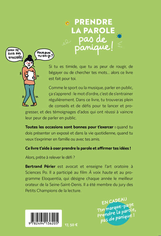 Comme le sport ou la musique, parler en public, ça s’apprend : le mot d’ordre, c’est de s’entrainer régulièrement. Dans ce livre, tu trouveras plein de conseils et de défis pour te lancer et progresser, et des témoignages d’ados qui ont réussi à vaincre leur peur de parler en public.