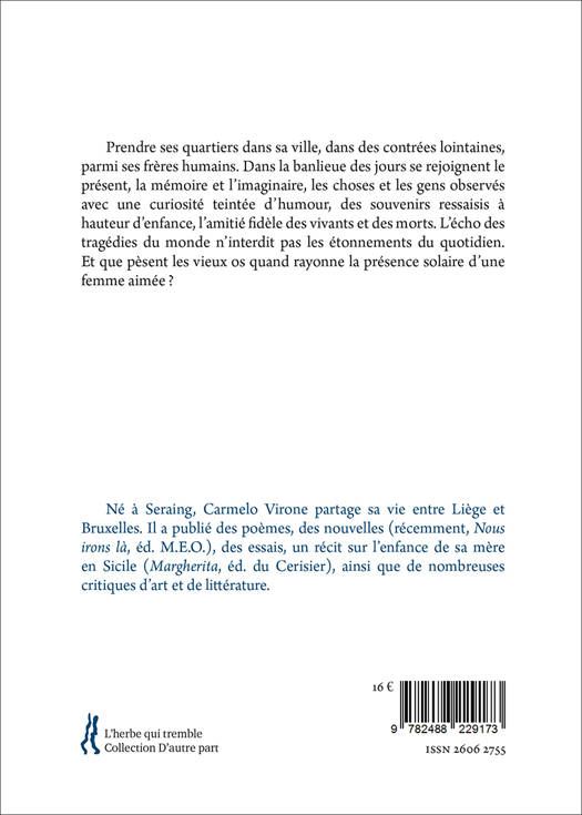 Prendre ses quartiers dans sa ville, dans des contrées lointaines, parmi ses frères humains. Dans la banlieue des jours se rejoignent le présent, la mémoire et l’imaginaire, les choses et les gens observés avec une curiosité teintée d’humour, des souvenirs ressaisis à hauteur d’enfance, l’amitié fidèle des vivants et des morts. L’écho des tragédies du monde n’interdit pas les étonnements du quotidien. Et que pèsent les vieux os quand rayonne la présence solaire d’une femme aimée ?