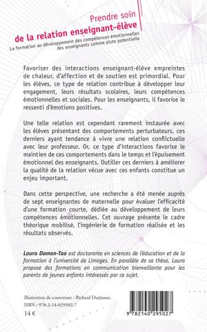 Favoriser des interactions enseignant-élève empreintes de chaleur, d'affection et de soutien est primordial. Pour les élèves, ce type de relation contribue à développer leur engagement, leurs résultats scolaires, leurs compétences émotionnelles et sociales. Pour les enseignants, il favorise le ressenti d'émotions positives. Une telle relation est cependant rarement instaurée avec les élèves présentant des comportements perturbateurs, ces derniers ayant tendance à vivre une relation conflictuelle avec leur professeur. Or, ce type d'interactions favorise le maintien de ces comportements dans le temps et l'épuisement émotionnel des enseignants. Outiller ces derniers à améliorer la qualité de la relation vécue avec ces enfants constitue un enjeu important. Dans cette perspective, une recherche a été menée auprès de sept enseignantes de maternelle pour évaluer l'efficacité d'une formation courte, dédiée au développement de leurs compétences émotionnelles. Cet ouvrage présente le cadre théorique mobilisé, l'ingénierie de formation réalisée et les résultats observés.