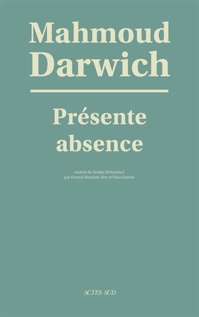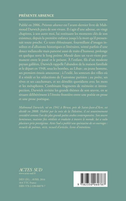 Publié en 2006, «Présente absence» est l'avant-dernier livre de Mahmoud Darwich paru de son vivant. Il s'agit d'une adresse, en vingt chapitres, à son autre moi, lui restituant les moments clés de son existence, depuis la première enfance jusqu'à la mort qu'il pressentait toute proche. Ce texte éblouissant, fourmillant d'images insolites et d'allusions historiques et littéraires, teinté parfois d'une douce mélancolie mais parsemé aussi de traits d'humour, prolonge en quelque sorte le long poème «Murale» dans un va-et-vient permanent entre le passé et le présent. À l'enfant, fils d'un modeste paysan galiléen, Darwich rappelle l'abandon de la maison familiale et le départ en 1948, sous les bombes, au Liban ; au jeune homme, ses premiers émois amoureux ; à l'exilé, les senteurs des villes où il a résidé et les séductions de l'automne parisien ; au poète, ses rêves et ses cauchemars, et ses démêlés quotidiens avec les mots et les métaphores. Combinant fragments de mémoire et introspection, Darwich revisite les grands thèmes de son oeuvre, en se situant délibérément à l'étroite frontière entre une poésie en prose et une prose poétique.