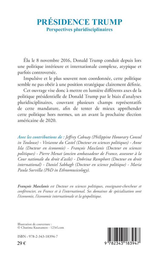 Élu le 8 novembre 2016, Donald Trump conduit depuis lors une politique intérieure et internationale complexe, atypique et parfois controversée. Impulsive et le plus souvent non coordonnée, cette politique semble ne pas obéir à une position stratégique clairement définie. Cet ouvrage vise donc à mettre en lumière différents axes de la politique présidentielle de Donald Trump par le biais d'analyses pluridisciplinaires, couvrant plusieurs champs représentatifs de cette mandature, afin de tenter de mieux appréhender cette politique hors normes.