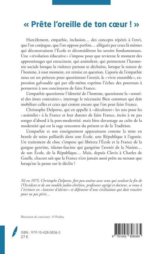 Harcèlement, empathie, inclusion... des concepts répétés à l'envi, que l'on conjugue, que l'on oppose parfois... allégués par ceux-là mêmes qui déconstruisent l'École et déconsidèrent les savoirs fondamentaux. Une révolution éducative s'impose pour que revienne le moment des apprentissages qui enracinent, qui assimilent, qui permettent l'harmonie sociale lorsque la violence partout se déchaîne, lorsque la nature de l'homme, à tout moment, est remise en question. L'aporie de l'empathie nous est un prétexte pour questionner l'avenir, le vivre ensemble , expression galvaudée qui par elle-même exprime l'échec des potentats à permettre à nos concitoyens de faire France. L'empathie questionne l'identité de l'homme, questionne la sororité des âmes contraires , interroge le nécessaire Bien commun qui doit mobiliser celles et ceux qui croient encore que l'on peut faire France. Christophe Delporte, qui en appelle à déculturer les uns pour les assimiler à la France et leur donner de faire France, incite à ne pas songer d'abord à la post-modernité, mais bien davantage au culte de la modernité qui est la sage rencontre du présent et de la Tradition. L'empathie et son enseignement apparaissent comme la mise en branle de soins palliatifs dans une École, une République à l'agonie. Un traitement de choc s'impose qui libérera l'École et la France de la gangue genriste, islamo-fasciste qui gangrène l'avenir de la Nation... de son École, de la République... Mais, depuis Clovis à Charles de Gaulle, chacun sait que la France n'est jamais aussi prête au sursaut que lorsqu'on la pense sur le déclin !