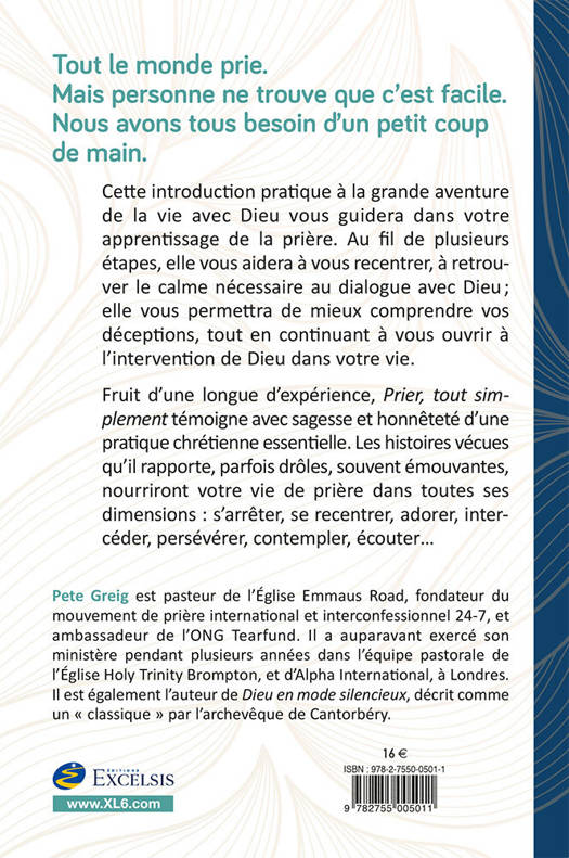 Tout le monde prie. Mais personne ne trouve que c’est facile. Nous avons tous besoin d’un petit coup de main. Cette introduction pratique à la grande aventure de la vie avec Dieu vous guidera dans votre apprentissage de la prière. Au fil de plusieurs étapes, elle vous aidera à vous recentrer, à retrouver le calme nécessaire au dialogue avec Dieu , elle vous permettra de mieux comprendre vos déceptions, tout en continuant à vous ouvrir à l’intervention de Dieu dans votre vie. Fruit d’une longue d’expérience, Prier, tout simplement témoigne avec sagesse et honnêteté d’une pratique chrétienne essentielle. Les histoires vécues qu’il rapporte, parfois drôles, souvent émouvantes, nourriront votre vie de prière dans toutes ses dimensions : s’arrêter, se recentrer, adorer, intercéder, persévérer, contempler, écouter…