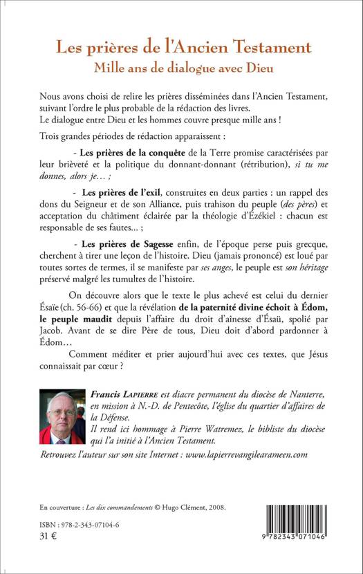 Francis Lapierre rend hommage à Pierre Watremez en proposant une relecture des prières disséminées dans l'Ancien Testament. Trois grandes périodes apparaissent : les prières de la conquête de la terre promise, les prières de l'exil et enfin, les prières de Sagesse de l'époque perse puis grecque. On découvre que le texte le plus achevé est celui du dernier Esaïe (ch. 56-66). Comment méditer et prier avec ces textes que Jésus connaissait par coeur ?