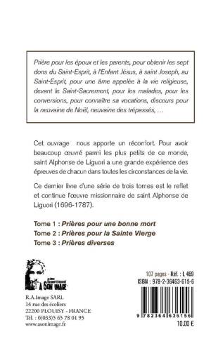 Ces recueils de prières de saint Alphonse de Liguori (1696-1787 - Docteur de l'Église) présentent un secours spirituel et temporel pour toutes les circonstances de la vie. Le premier vise à nous faire craindre le jugement de Dieu et nous encourage à demander sans tarder la grâce de la persévérance pour nous préparer à la mort en demeurant dans l'amour de Dieu. Le second nous fait partager la grande dévotion de saint Alphonse à la Sainte Vierge et le troisième nous offre une assistance dans les épreuves que nous sommes amenés à traverser, conformément eu désir de saint Alphonse d'évangéliser le plus grand nombre.