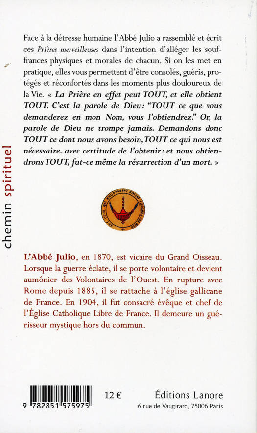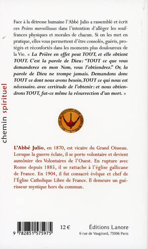 Face à la détresse humaine l'Abbé Julio a rassemblé et écrit ces Prières merveilleuses dans l'intention d'alléger les souffrances physiques et morales de chacun. Si on les met en pratique, elles vous permettent d'être consolés, guéris, protégés et réconfortés dans les moments plus douloureux de la Vie. " La Prière en effet peut TOUT, et elle obtient TOUT. C'est la parole de Dieu" : "TOUT ce que vous demanderez en mon Nom, vous l'obtiendrez." Or, la parole de Dieu ne trompe jamais. Demandons donc TOUT ce dont nous avons besoin, TOUT ce qui nous est nécessaire, avec certitude de l'obtenir, et nous obtiendrons TOUT, fut-ce même la résurrection d'un mort.