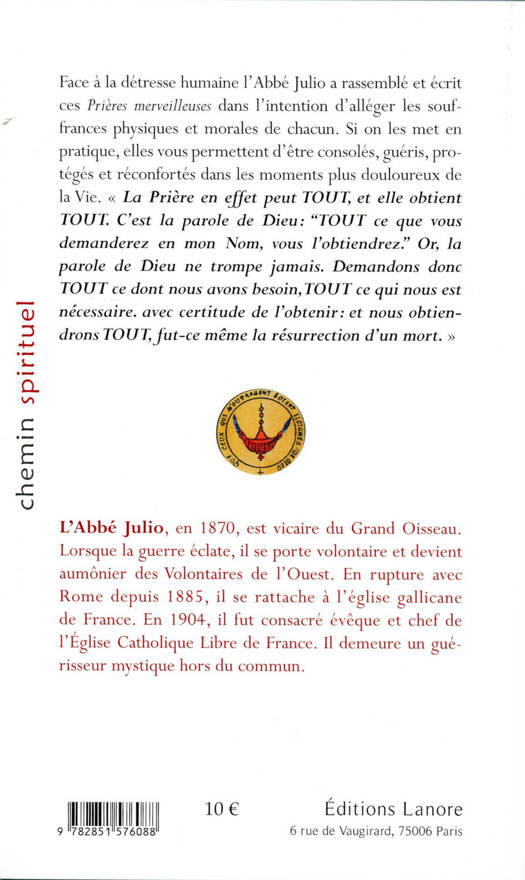 Face à la détresse humaine l'Abbé Julio a rassemblé et écrit ces Prières merveilleuses dans l'intention d'alléger les souffrances physiques et morales de chacun. Si on les met en pratique, elles vous permettent d'être consolés, guéris, protégés et réconfortés dans les moments plus douloureux de la Vie. " La Prière en effet peut TOUT, et elle obtient TOUT. C'est la parole de Dieu" : "TOUT ce que vous demanderez en mon Nom, vous l'obtiendrez." Or, la parole de Dieu ne trompe jamais. Demandons donc TOUT ce dont nous avons besoin, TOUT ce qui nous est nécessaire, avec certitude de l'obtenir, et nous obtiendrons TOUT, fut-ce même la résurrection d'un mort.