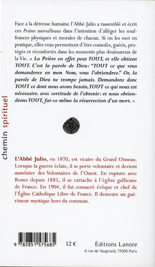 Face à la détresse humaine l'Abbé Julio a rassemblé et écrit ces " Prières merveilleuses " dans l'intention d'alléger les souffrances physiques et morales de chacun. Si on les met en pratique, elles vous permettent d'être consolés, guéris, protégés et réconfortés dans les moments plus douloureux de la Vie. " La Prière en effet peut tout, et elle obtient, tout." C'est la parole de Dieu : "tout ce que vous demanderez en mon Nom, vous l'obtiendrez." Or, la parole de Dieu ne trompe jamais. Demandons donc tout ce dont nous avons besoin, tout ce qui nous est nécessaire, avec certitude de l'obtenir, et nous obtiendrons tout, fut-ce même la résurrection d'un mort.