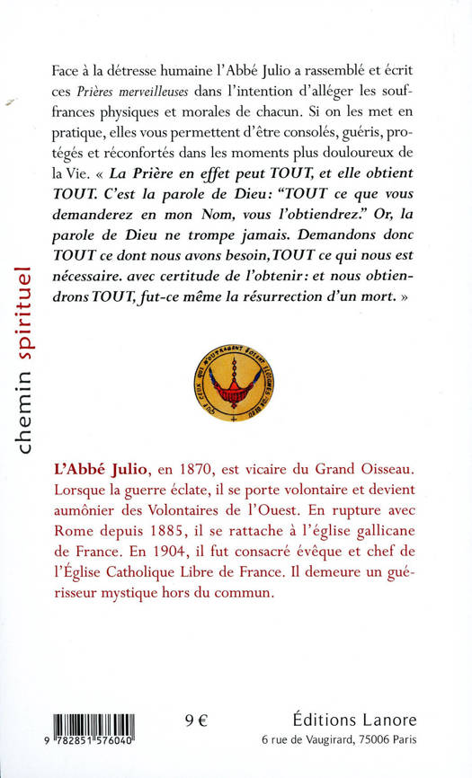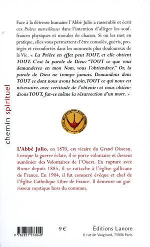 Face à la détresse humaine l'Abbé Julio a rassemblé et écrit ces Prières merveilleuses dans l'intention d'alléger les souffrances physiques et morales de chacun. Si on les met en pratique, elles vous permettent d'être consolés, guéris, protégés et réconfortés dans les moments plus douloureux de la Vie. "La Prière en effet peut tout, et elle obtient tout. C'est la parole de Dieu" : "tout ce que vous demanderez en mon Nom, vous l'obtiendrez." Or, la parole de Dieu ne trompe jamais. Demandons donc tout ce dont nous avons besoin, tout ce qui nous est nécessaire, avec certitude de l'obtenir, et nous obtiendrons tout, fut-ce même la résurrection d'un mort.