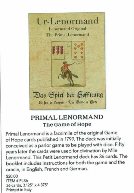 Primal Lenormand is a facsimile of the original Game of Hope cards published in 1799. The deck was initially conceived as a parlor game to be played with dice. Fifty years later the cards were used for divination by Mlle Lenormand. This Petit Lenormand deck has 36 cards. The booklet includes instructions for both the game and the oracle, in English, French and German.