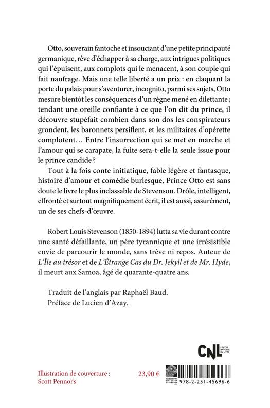 Otto, souverain fantoche et insouciant d'une petite principaute germanique, reve d'echapper a sa charge, aux intrigues politiques qui l'epuisent, aux complots qui le menacent, a son couple qui fait naufrage. Mais une telle liberte a un prix: en claquant la porte du palais pour s'aventurer, incognito, parmi ses sujets, Otto mesure bientot les consequences d'un regne mene en dilettante; tendant une oreille confiante a ce que l'on dit du prince, il decouvre stupefait combien dans son dos les conspirateurs grondent, les baronnets persiflent, et les militaires d'operette complotent Entre l'insurrection qui se met en marche et l'amour qui se carapate, la fuite sera-t-elle la seule issue pour le prince candide ? Tout a la fois conte initiatique, fable legere et fantasque, histoire d'amour et comedie burlesque, Prince Otto est sans doute le livre le plus inclassable de Stevenson. Drole, intelligent, effronte et surtout magnifiquement ecrit, il est aussi, assurement, un de ses chefs-d'oeuvre.