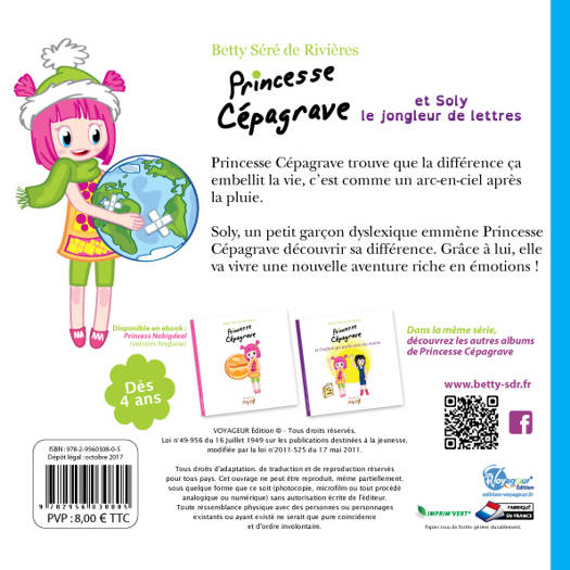 Thème : La dyslexie. Dans ce troisième album, écrit par Betty Séré de Rivières et aux illustrations douces et colorées de Philippe Wolff, Princesse Cépagrave rencontre Soly. Ce petit garçon dyslexique emmène Princesse Cépagrave découvrir sa différence. Grâce à lui, elle va vivre une nouvelle aventure riche en émotions !