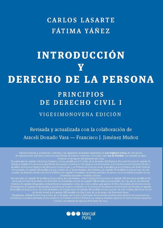 Son varias las razones que permiten enjuiciar admirativamente la obra del profesor Lasarte que inicia su andadura con este primer tomo dedicado, básicamente, al Derecho de la persona y a la tradicionalmente denominada «Parte General» del Derecho civil. La primera de ellas, probablemente, radique en su vibrante y atractiva prosa, que carece de parangón en obras de similar naturaleza. A ella se suman sin duda su magnífica información bibliográfica y jurisprudencial, la riqueza de contenido y de aspectos reflexivos, así como su excelente actualización.La presente edición se encuentra rigurosamente actualizada, conforme a las nuevas disposiciones normativas de las que se ofrece ya un avance en la propia faja de cubierta de esta edición y, con mayor detalle y extensión, en el prólogo. En cuanto a novedades legislativas, se incorporan a esta edición: la Ley Orgánica 2/2024, de 1 de agosto, de representación paritaria y presencia equilibrada de mujeres y hombres, conocida popularmente como Ley de Paridad, con entrada en vigor el jueves 22 de agosto del presente año 2024.De otro lado, debemos mencionar el reciente Real Decreto Ley 4/2024, de 26 de junio, por el que se prorrogan determinadas medidas para afrontar las consecuencias económicas y sociales derivadas de los conflictos en Ucrania y Oriente Próximo y se adoptan medidas urgentes en materia fiscal, energética y social, con entrada en vigor el 28 de junio de 2024.