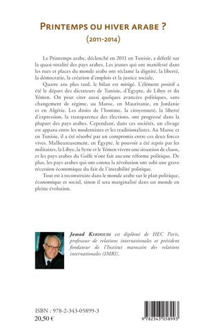 Quatre ans après le Printemps arabe, le bilan est mitigé. Malgré le départ de nombreux dictateurs, les avancées politiques dans certains pays ou la progression des droits de l'homme, un clivage est apparu entre modernistes et traditionnalistes. De plus, ces pays ont subi une grave récession économique du fait de l'instabilité politique. Le monde arabe est à reconstruire sur le plan politique, économique et social, sinon il sera marginalisé dans un monde en pleine évolution.