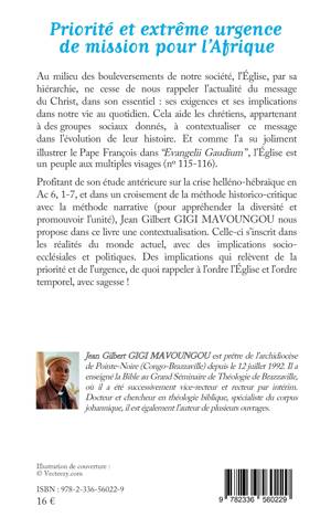 Au milieu des bouleversements de notre société, l'Église, par sa hiérarchie, ne cesse de nous rappeler l'actualité du message du Christ, dans son essentiel: ses exigences et ses implications dans notre vie au quotidien. Cela aide les chrétiens, appartenant à des groupes sociaux donnés, à contextualiser ce message dans l'évolution de leur histoire. Et comme l'a su joliment illustrer le Pape François dans ''Evangelii Gaudium '', l'Église est un peuple aux multiples visages (n° 115-116). Profitant de son étude antérieure sur la crise helléno-hébraïque en Ac 6, 1-7, et dans un croisement de la méthode historico-critique avec la méthode narrative (pour appréhender la diversité et promouvoir l'unité), Jean Gilbert GIGI MAVOUNGOU nous propose dans ce livre une contextualisation. Celle-ci s'inscrit dans les réalités du monde actuel, avec des implications socio- ecclésiales et politiques. Des implications qui relèvent de la priorité et de l'urgence, de quoi rappeler à l'ordre l'Église et l'ordre temporel, avec sagesse !
