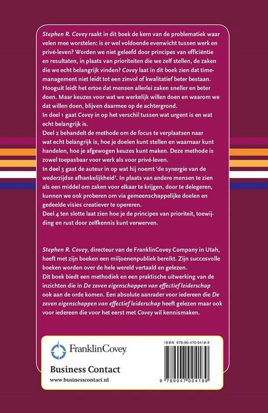 Covey raakt in dit boek de kern van de problematiek waar velen in hun leven mee worstelen. Ze vragen zich af of er wel voldoende evenwicht is tussen werk en privéleven, of ze niet geleefd worden door principes van efficiëntie en resultaten in plaats van prioriteiten die ze zelf stellen. Covey laat in dit boek zien dat time-management niet leidt tot een zinvol of kwalitatief bestaan. Hooguit leidt het ertoe dat mensen allerlei zaken sneller en beter doen. Maar de keuze voor wat we werkelijk willen doen en waarom we dat willen doen, blijft daarmee op de achtergrond.