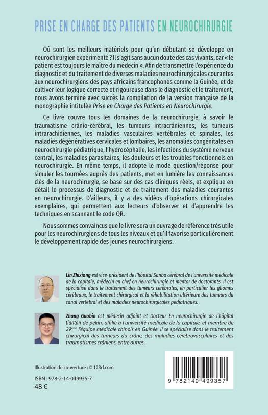 Où sont les meilleurs matériels pour qu'un débutant se développe en neurochirurgien expérimenté ? Afin de transmettre l'expérience du diagnostic et du traitement de diverses maladies neurochirurgicales courantes aux neurochirurgiens des pays africains francophones comme la Guinée, et de cultiver leur logique correcte et rigoureuse dans le diagnostic et le traitement, nous avons terminé avec succès la compilation de la version française de la monographie intitulée Prise en Charge des Patients en Neurochirurgie. Ce livre couvre tous les domaines de la neurochirurgie, à savoir le traumatisme crânio-cérébral, les tumeurs intracrâniennes, les tumeurs intrarachidiennes, les maladies vasculaires vertébrales et spinales, les maladies dégénératives cervicales et lombaires, les anomalies congénitales en neurochirurgie pédiatrique, l'hydrocéphalie, les infections du système nerveux central, les maladies parasitaires, les douleurs et les troubles fonctionnels en neurochirurgie. En même temps, il adopte le mode question/réponse pour simuler les tournées auprès des patients, met en lumière les connaissances clés de la neurochirurgie, se base sur des cas cliniques réels, et explique en détail le processus de diagnostic et de traitement des maladies courantes en neurochirurgie. Ce livre sera un ouvrage de référence très utile pour les neurochirurgiens de tous les niveaux.