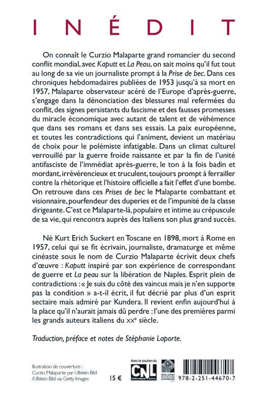 On connait le Curzio Malaparte grand romancier du second conflit mondial, avec Kaputt et La Peau, on sait moins qu'il fut tout au long de sa vie un journaliste prompt a la Prise de bec. Dans ces chroniques hebdomadaires publiees de 1953 jusqu'a sa mort en 1957, Malaparte observateur acere de l'Europe d'apres-guerre, s'engage dans la denonciation des blessures mal refermees du conflit, des signes persistants du fascisme et des fausses promesses du miracle economique avec autant de talent et de vehemence que dans ses romans et dans ses essais. La paix europeenne, et toutes les contradictions qui l'animent, devient un materiau de choix pour le polemiste infatigable. Dans un climat culturel verrouille par la guerre froide naissante et par la fin de l'unite antifasciste de l'immediat apres-guerre, le ton a la fois badin et mordant, irreverencieux et truculent, toujours prompt a ferrailler contre la rhetorique et l'histoire officielle a fait l'effet d'une bombe. On retrouve dans ces Prises de bec le Malaparte combattant et visionnaire, pourfendeur des duperies et de l'impunite de la classe dirigeante. C'est ce Malaparte-la, populaire et intime au crepuscule de sa vie, qui rencontra aupres des Italiens son plus grand succes.